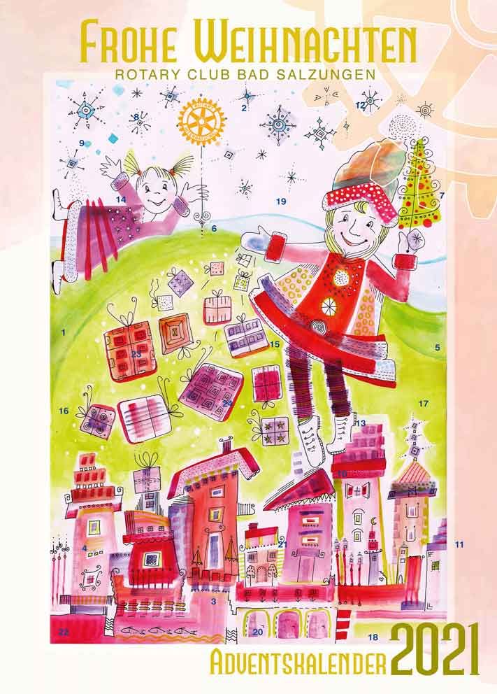 Für das gemeinnützige Projekt des Rotary Clubs Bad Salzungen entwerfe ich jedes Jahr ehrenamtlich einen Adventskalender, in dem verschiedene Preise anderer Mitglieder des Clubs enthalten sind. Sie werden zwischen November und Dezember verkauft und der Erlös wird an ein gemeinnütziges Projekt des Clubs gespendet.